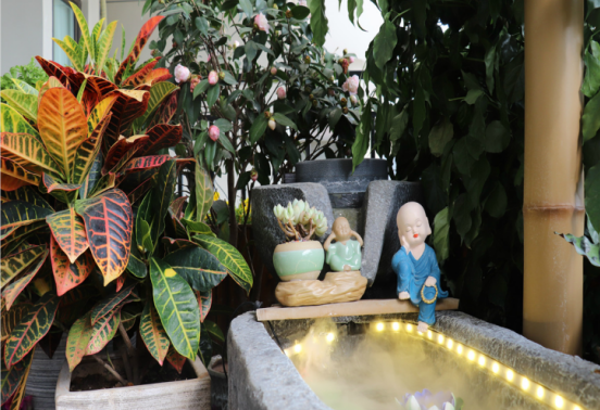 通过对花草山石的规划布置,满足父母向往田园生活、莳花弄草的生活体会,同时这方空间成为居住的点睛之笔。
