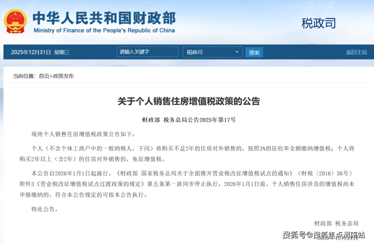 中房网讯 (苏晓/文)12月30日,财政部、税务总局发布《关于个人销售住房增值税政策的公告》,明确个人将购买不足2年的住房对外销售的,按照3%的征收率全额缴纳增值税;个人将购买2年以上(含2年)的住房对外销售的,免征增值税。上述公告自2026年1月1日起施行。