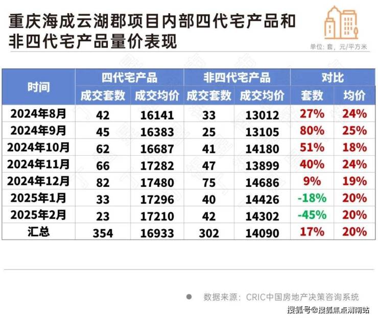 比如重庆海成云湖郡项目,该项目主力产品为小高层和四代宅产品,从项目内部不同产品量价来看,购房者普遍愿意为四代宅产品买单,数据显示2024年8月以来该项目四代宅产品共成交了354套,均价1.7万元/平方米左右,量价相较于非四代宅产品均高出两成左右,表现出“有价有市”的特征。
