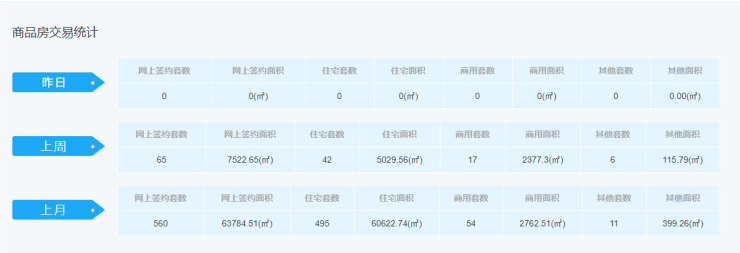 根据渭南信息公示网显示,渭南楼市上周网上签约套数65套,签约面积7522.65(㎡)。其中住宅套数42套,住宅面积5029.56(㎡)。