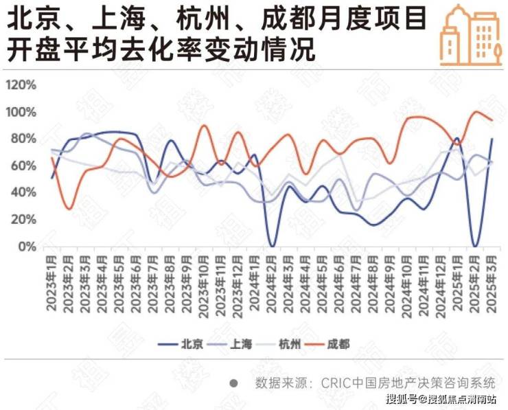 CRIC监测数据显示,北京、上海、杭州、成都四城自2024年下半年以来开盘去化率波动上行,截至2025年3月月末,开盘去化率均在六成以上,其中成都最高,达94%,北京第二,达80%,上海和杭州与北京和成都相比相对较低分别达63%和62%。