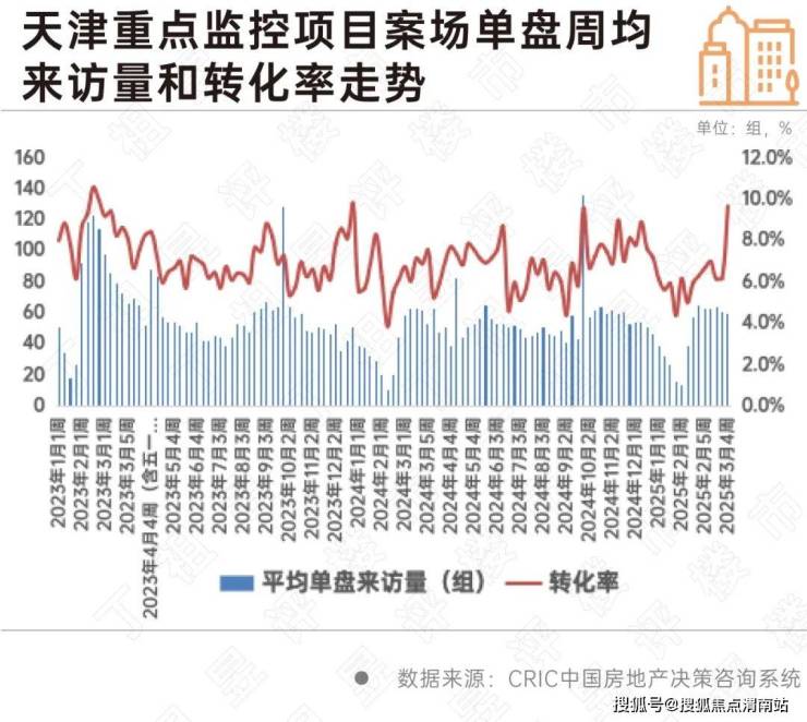 再如天津,据CRIC监测重点项目显示,新房市场节后逐步修复,受房企折扣力度增强,推出特价房、工抵房等聚集人气,吸引客户,项目来访量、认购量稳中有增,特别是进入3月以来,单周平均来访量持稳60组,而反观客户转化率,3月前3周持稳6%-7%,月末冲高至9.7%。