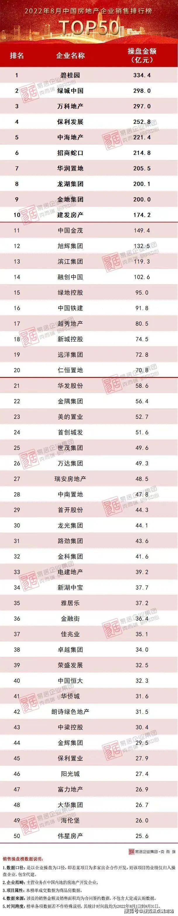 附:2022年8月中国房地产企业销售排行榜TOP50