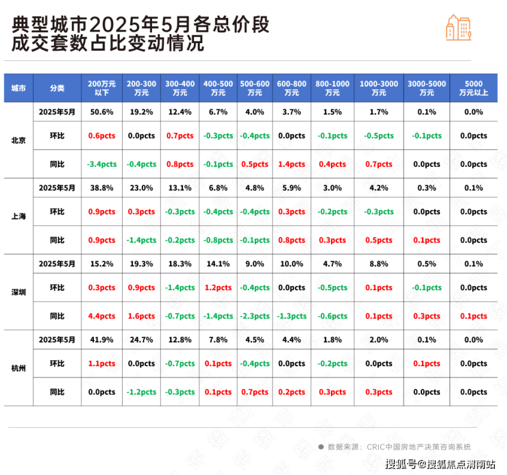 与之相对应的另一个明显特征是,低总价房源成交集中度仍有上行趋势。比如深圳,2025年5月总价300万以内房源成交套数占比为34.5%,环比上升1.2个百分点,同比上升6.0个百分点,低总价房源市场份额进一步扩大。