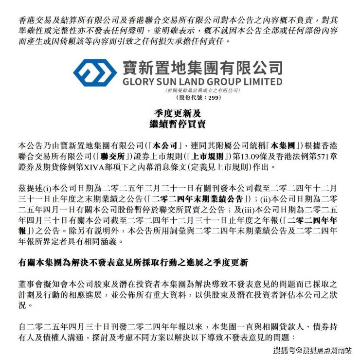 根据公告,董事会拟知会公司股东及潜在投资者集团为解决导致不发表意见的问题而已采取的计划及行动的相应进展。自2025年4月30日刊发2024年年报以来,集团一直与相关贷款人、债券持有人及债权人沟通,探讨及考虑不同方案以解决以下导致不发表意见的问题: