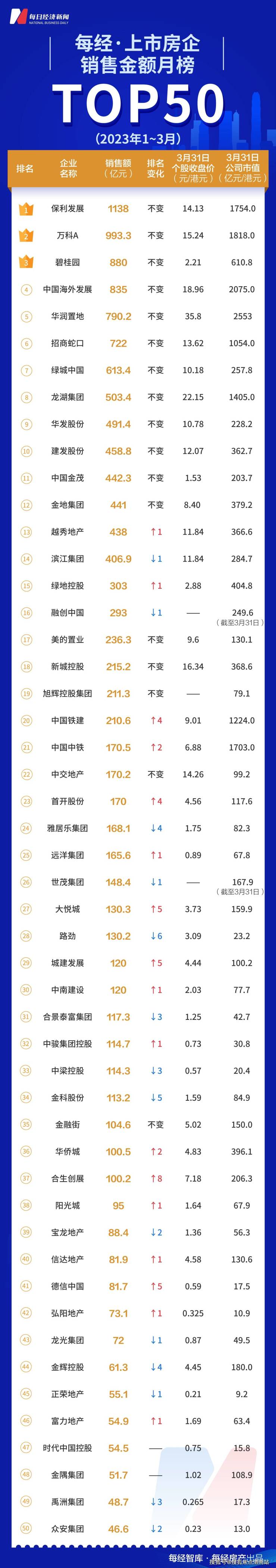 (原标题:每经数读| 一季度TOP50房企卖出1.37万亿元,只有保利独自冲上千亿)来自每日经济新闻