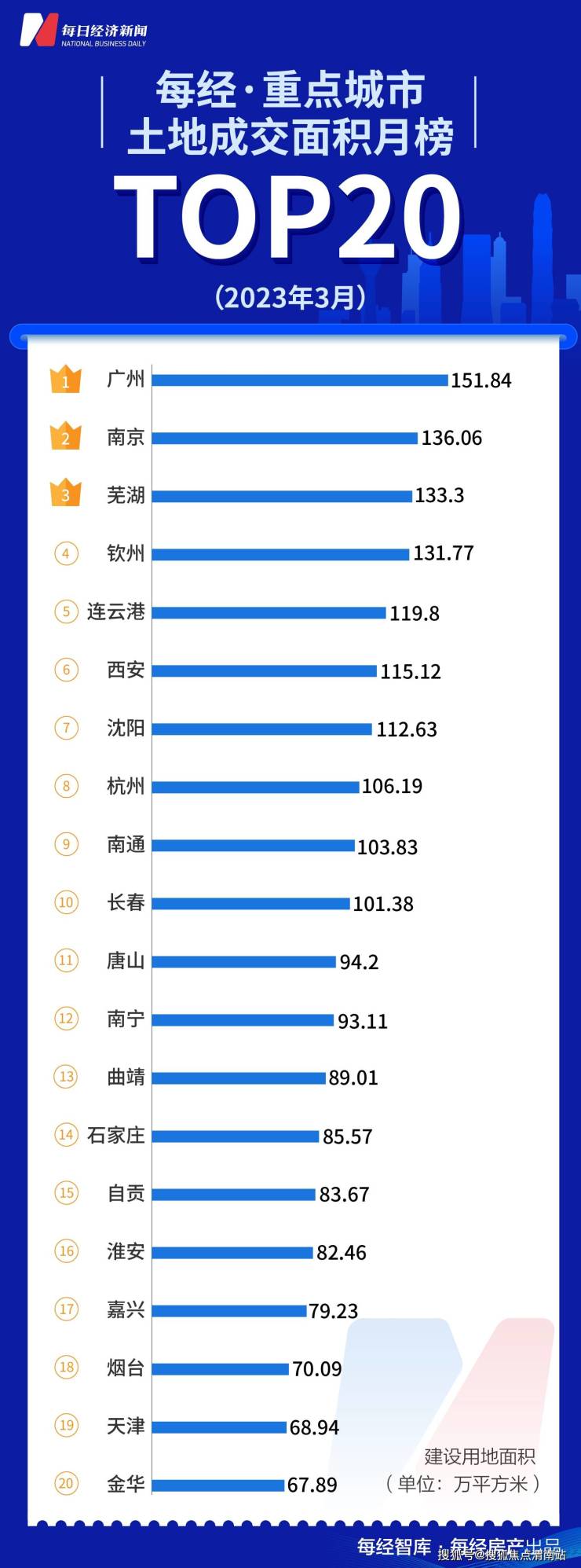 3月份土地出让面积TOP20城市合计成交2026万平方米,其中广州、南京、芜湖成交面积分列前三位。
