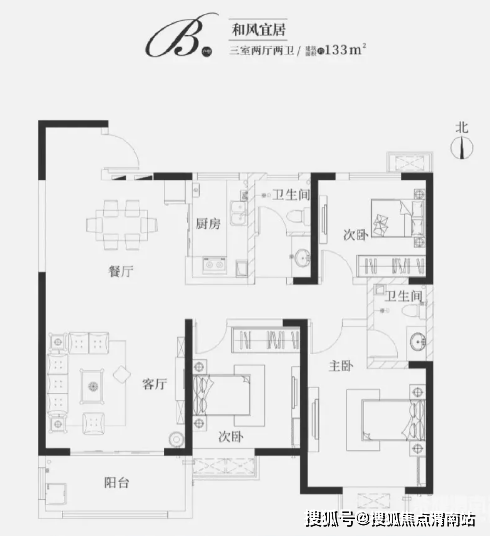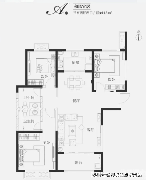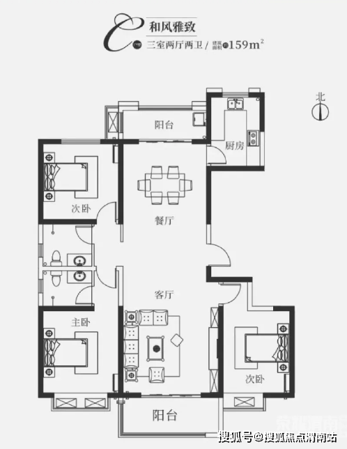 面积段:132㎡、142㎡和159㎡三室两厅两卫