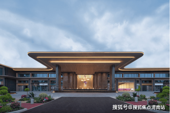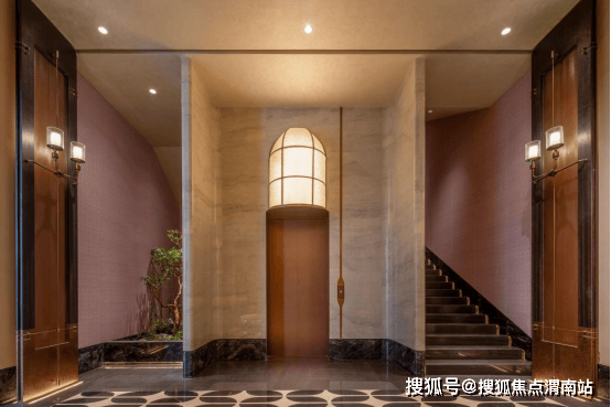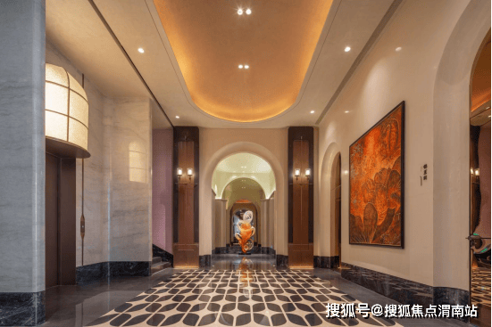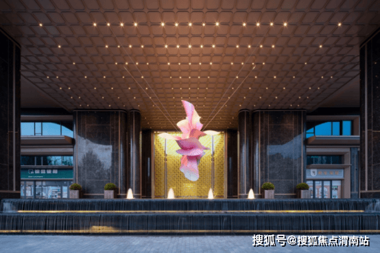 主入口迎面可见是的邀著名艺术家高定的“金翎垂棠”海棠花瓣造型雕塑作品,鎏金铝板与粉色海棠在波光中交融,既寄托了绿城寄语业主“金玉满堂”的美好愿景,也是每一次出发与归来的视觉艺术体验。以“锦绣丝滑”的流动美学为基底与海棠的瑰丽感为建筑语言 ,打造的高度达约9.8 米的双弧曲线,三层叠顶,宽幅约57米如丝绸飘逸,象征人生“锦绣前程”的延展性;穹顶下方采用英国棕石材的罗马柱,采用“圆弧倒角”的曲面石材拼接,寓意圆满无缺,锦绣传家。