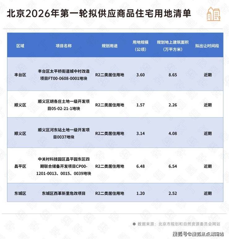 北京亦是如此,2026年首批拟供应的5宗土地,从东城区二环核心区到昌平区潜力板块,既有二环豪宅,又涵盖昌平区1.01超低容积率地块,且地块均处于市场需求突出、基础设施和公共服务配套较完善的区域。其中东城区西革新里危改项目地块和丰台区太平街道城中村改造项目无疑是北京2026年节后首场土拍的亮点。