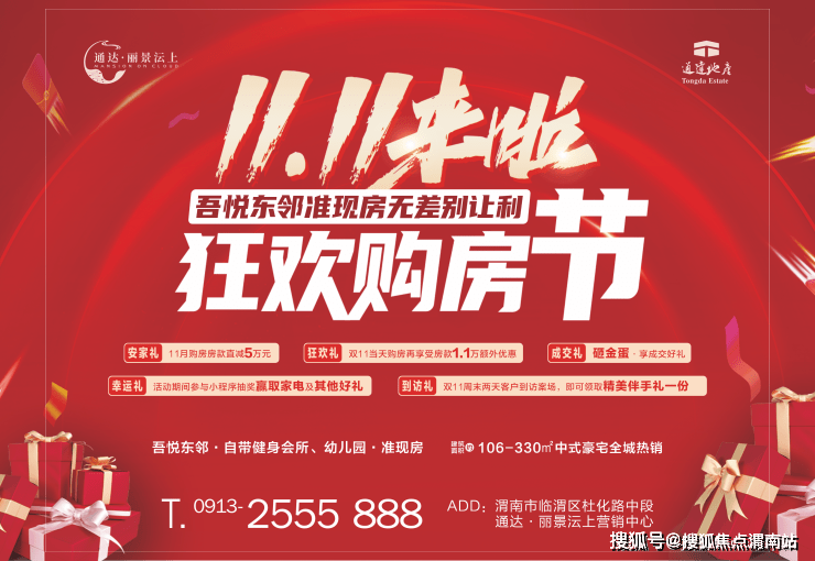 通达·丽景沄上11.11特惠购房五大优惠:购房直减5万、11.11当天再减1.1万、金蛋好礼、抽奖赢取家电好礼、双十一周末到访礼。 诸多好礼谁不心动,房子和礼品我全都要!