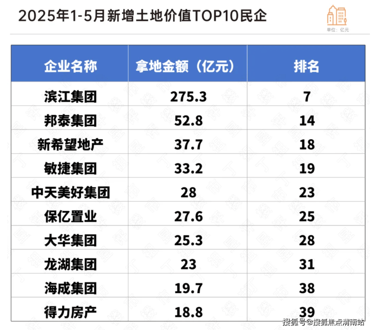 记者梳理发现,今年前5月,包括新希望地产、中天美好集团、保亿置业、大华集团、龙湖集团、海成集团、得力房产在内的民营房企,均进入克而瑞房企拿地金额榜前四十行列。