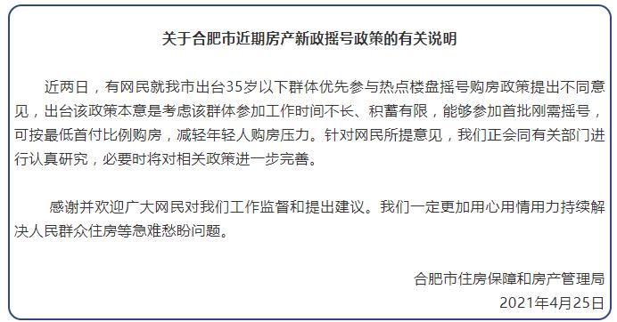 据合肥市委市政府新媒体平台4月25日消息,合肥市住房保障和房产管理局当日再度回应近期房产新政摇号政策相关热点。