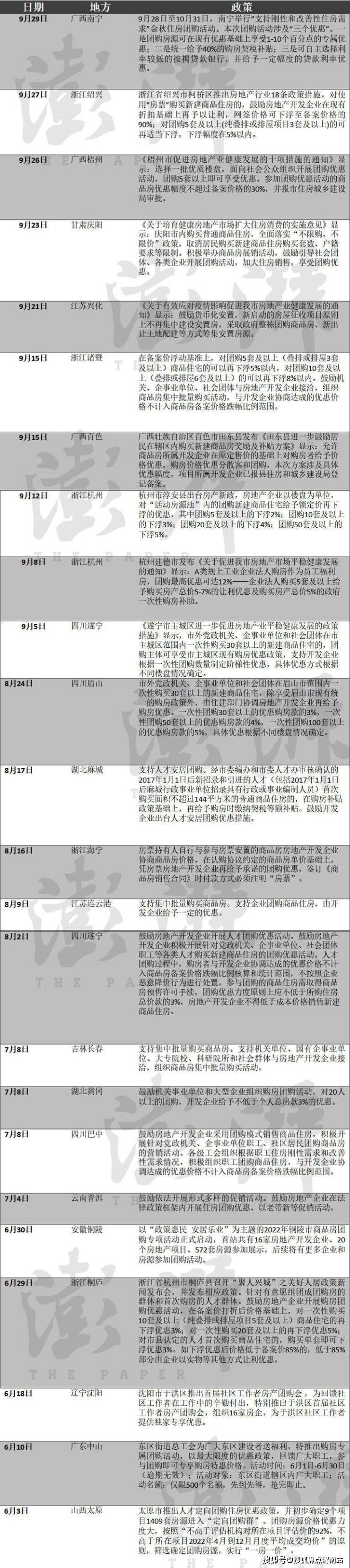 据澎湃新闻不完全统计,今年6月以来截至9月30日,至少包括山西太原、广东中山、辽宁沈阳、浙江桐庐、安徽铜陵、云南普洱、四川巴中、湖北黄冈、吉林长春、四川遂宁、江苏连云港、浙江海宁、湖北麻城、四川眉山、浙江杭州、广西百色、浙江诸暨、江苏兴化、甘肃庆阳、广西梧州、浙江绍兴、广西南宁等地发布“购房团购”相关政策或活动。