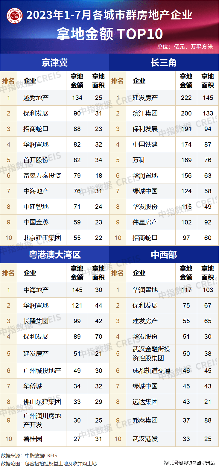 从全国范围看,区域分化仍在延续。从各城市群拿地金额来看,长三角地区领跑全国。2023年1-7月,长三角TOP10企业拿地金额1550亿元,居四大城市群之首。其中,建发房产拿地金额为222亿元,位居长三角企业拿地金额榜首;京津冀TOP10企业拿地金额816亿元,位列第二;粤港澳TOP10企业拿地金额678亿元,位列第三。拿地面积来看,长三角TOP10企业拿地面积以857万平方米位居四区域首位,超越中西部TOP10企业。