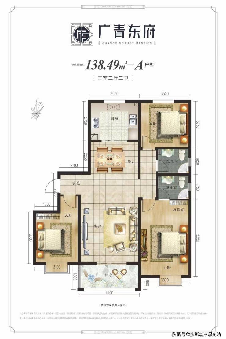 广青东府建面约138㎡三室两厅两卫,大三室,南北通透,三面朝南,动静分区,主卧及南向次卧带飘窗,主卧带独立卫生间,长4.2m阳台进深1.8m,视野绝佳。