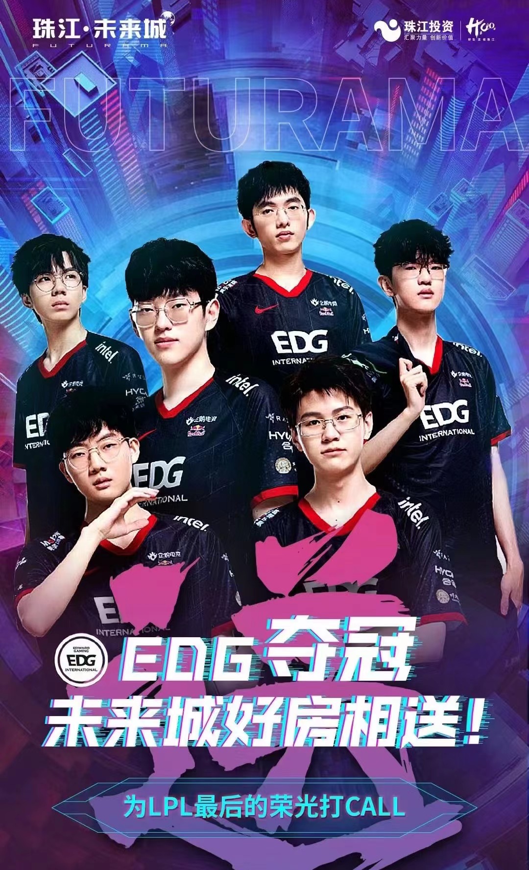 与夺冠消息一起被刷屏的,还有地产商的一张宣传海报。比赛前夕,总部位于广州的民营地产商珠江投资承诺:如EDG夺冠就送房,每名队员一套。