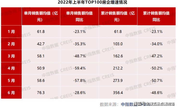 中指研究院较新统计显示,上半年TOP100房企销售额均值356.4亿元,同比下降48.6%,相较1-5月降幅持续收窄,房企销售业绩边际性改善;销售额破千亿房企9家,较去年同期(19家)减少10家;百亿房企85家,较去年同期(132家)减少47家。