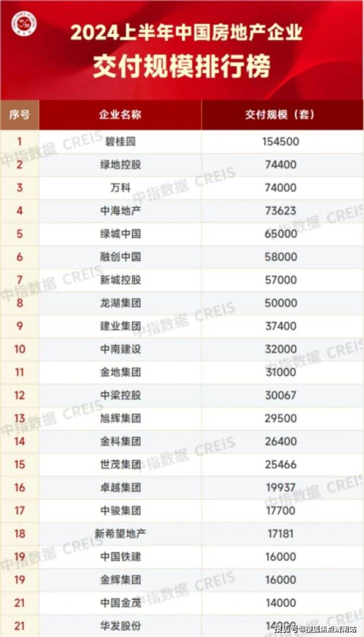 据中指研究院7月11日发布的《2024年上半年中国房地产企业交付规模排行榜》的数据,碧桂园、绿地控股、万科的交付套数分别为15.45万套、7.44万套和7.4万套,位居该榜单前三名。