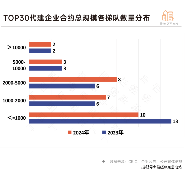 值得注意的是,部分代建企业实现梯队跃升,总合约规模在2000-5000万平方米、1000-2000万平方米的企业数量均有所增加,分别增加2家和1家至8家和7家。