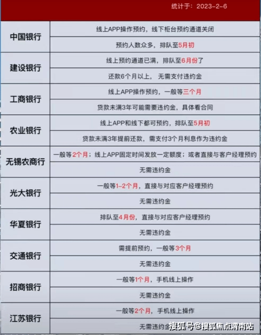 不同城市、不用银行提前还贷情况略有差异。以无锡来看,根据无锡楼市365统计,中国银行线上APP操作预约,线下柜台预约通道关闭; 建设银行线上预约通道已满,排队至6月份;工商银行线上APP操作预约,一般要等三个月;农业银行线上APP和线下都可预约,排队至5月初;交通银行需提前预约,一般等3个月,无需违约金;华夏银行排队至4月份,直接与对应客户经理预约,无需违约金。