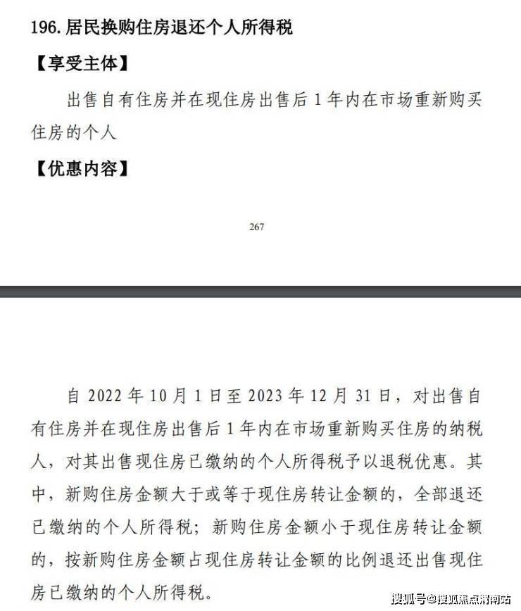 居民换购住房退还个人所得税政策也已于2022年发布。按照规定,自2022年10月1日至2023年12月31日,对出售自有住房并在现住房出售后1年内在市场重新购买住房的纳税人,对其出售现住房已缴纳的个人所得税予以退税优惠。其中,新购住房金额大于或等于现住房转让金额的,全部退还已缴纳的个人所得税;新购住房金额小于现住房转让金额的,按新购住房金额占现住房转让金额的比例退还出售现住房已缴纳的个人所得税。