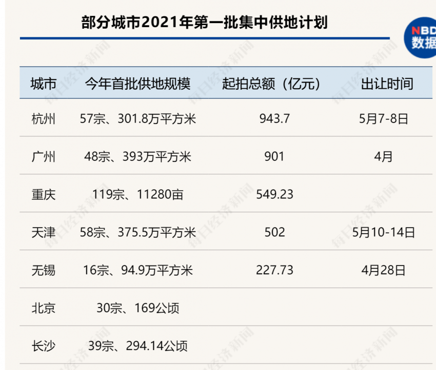4月7日凌晨,杭州57宗涉宅块集体挂牌,总出让面积301.8万平方米,总起拍价943.7亿元;同日,重庆发布今年排名前列批次宅地出让公告,共供应119宗宅地,共计约11280亩,总起始价549.23亿元。而不久前,北京、天津、广州、无锡、长沙等城市已经公布了今年排名前列批集中供地计划。