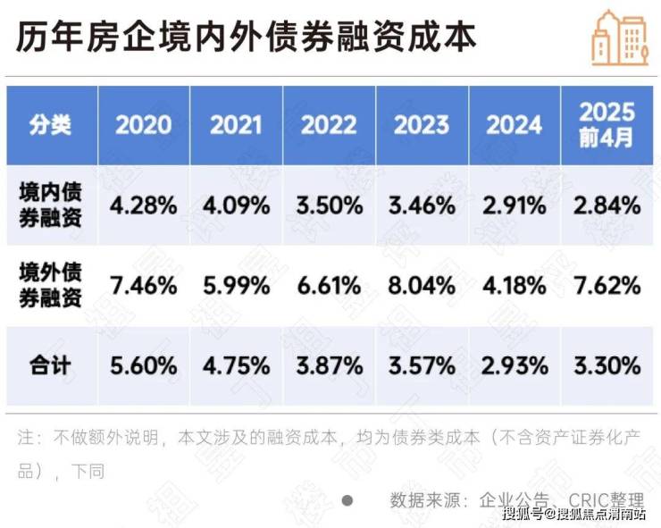 从企业的债券类融资成本来看,2025年前4月的境外债券融资成本为7.62%,主要是2025年2月绿城中国发行了一笔2028年到期的3.5亿美元8.45%优先票据;此外3月首创城发发行了3亿美元票面利率6.8%的美元债。目前境外债仍处于冰封状态,仅极少数房企有在境外发行债券的情况,且发行利率相对较高。