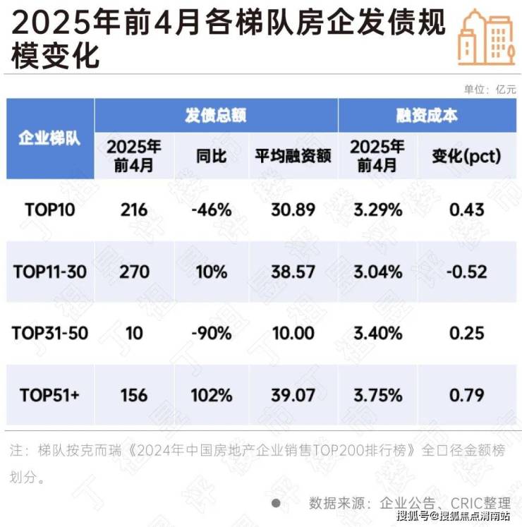 从各梯队发债表现来看,2025年前4月TOP10房企的发债总量是216亿,同比下降46%;TOP11-30房企同比上升10%。从平均融资额来看,TOP51+房企的平均融资额达到了39亿。从前4月各梯队融资成本来看,TOP10融资成本3.29%,同比增长约0.43个百分点。TOP11-30房企的融资成本最低仅3.04%,同比下降0.52个百分点。