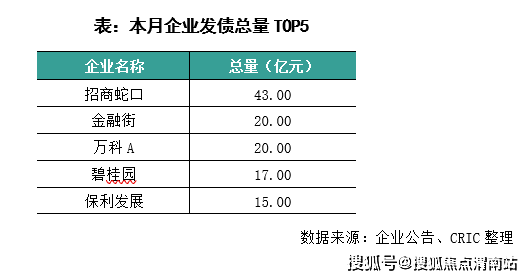 具体企业表现来看,5月债券发行量最大的企业是招商蛇口,招商蛇口5月发行了2笔共26亿元的超短融以及1笔17亿元的中期票据。5月发行债券的企业有11家,发债企业个数环比减少5家。从发债年限来看,金融街发行了1笔期限长达7年的公司债,是5月发行期限最长的债券。从债券发行利率表现来看,招商蛇口发行的2笔超短融利率都是2.2%,是5月房企发行的所有债券中最低利率。