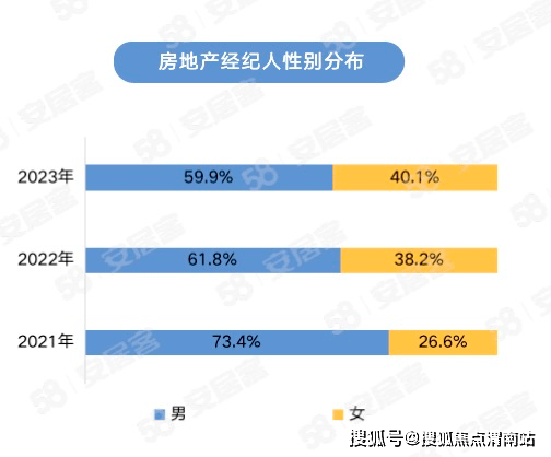 从历年数据可以看出,房地产经纪人中的女性占比逐年提升。报告显示,房地产经纪人中的女性占比从2021年的26.6%上升到2023年的40.1%,房地产经纪行业对女性从业者的认可度逐步提高。部分房地产经纪公司还面向“宝妈”等女性群体提供灵活的就业岗位,以及体系化的职业培训支持。