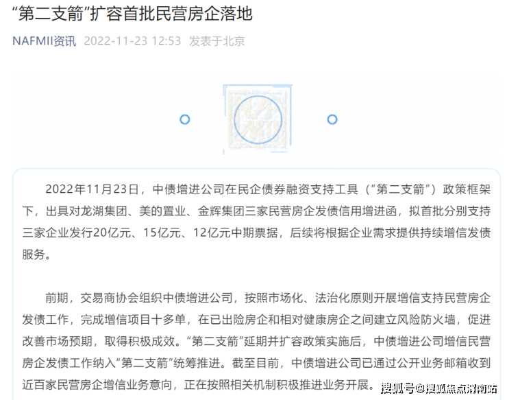 中国银行间市场交易商协会(以下简称交易商协会)官网也在11月23日披露,中债信用增进投资股份公司(以下简称中债增进公司)在民企债券融资支持工具(“第二支箭”)政策框架下,出具对龙湖集团、美的置业、金辉集团三家民营房企发债信用增进函,拟首批分别支持三家企业发行20亿元、15亿元、12亿元中期票据,后续将根据企业需求提供持续增信发债服务。
