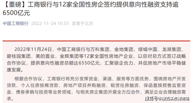 11月24日,中国工商银行发布消息称,与万科集团、金地集团、绿城中国、龙湖集团、碧桂园、美的置业、金辉集团等12家全国性房地产企业,以总对总方式签订战略合作协议,提供意向性融资总额达6550亿元。