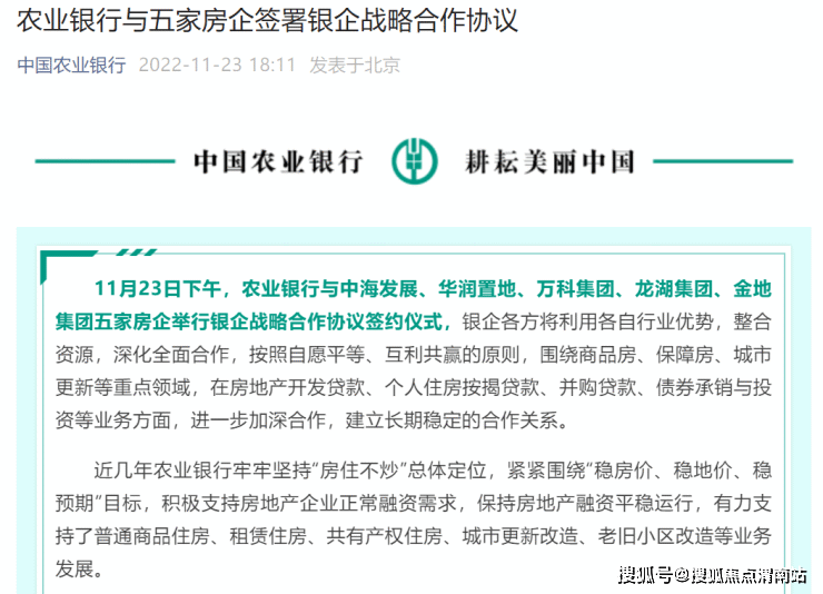 同日,中国农业银行发布消息称,与中海发展、华润置地、万科集团、龙湖集团、金地集团五家房企举行银企战略合作协议签约仪式,银企各方将利用各自行业优势,围绕商品房、保障房、城市更新等重点领域,在房地产开发贷款、个人住房按揭贷款、并购贷款、债券承销与投资等业务方面,进一步加深合作,建立长期稳定的合作关系。