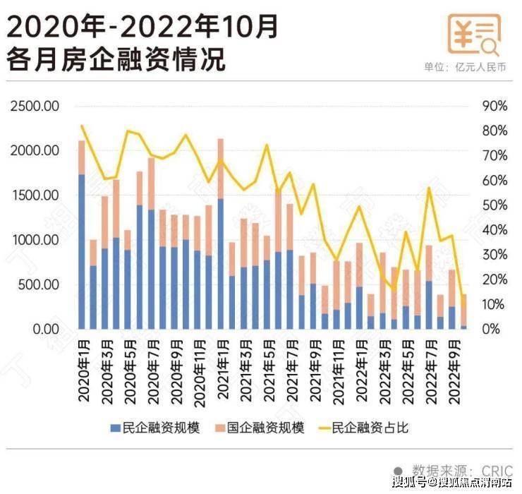 据克而瑞对100家典型房企的融资监测显示,民营房企融资规模的占比从2021年8月首次跌破50%之后持续下跌,至今年10月时仅占10%。2022年前10月,民营房企累计融资总额2291亿元,同比减少68%,其中债券发行规模同比减少58%。