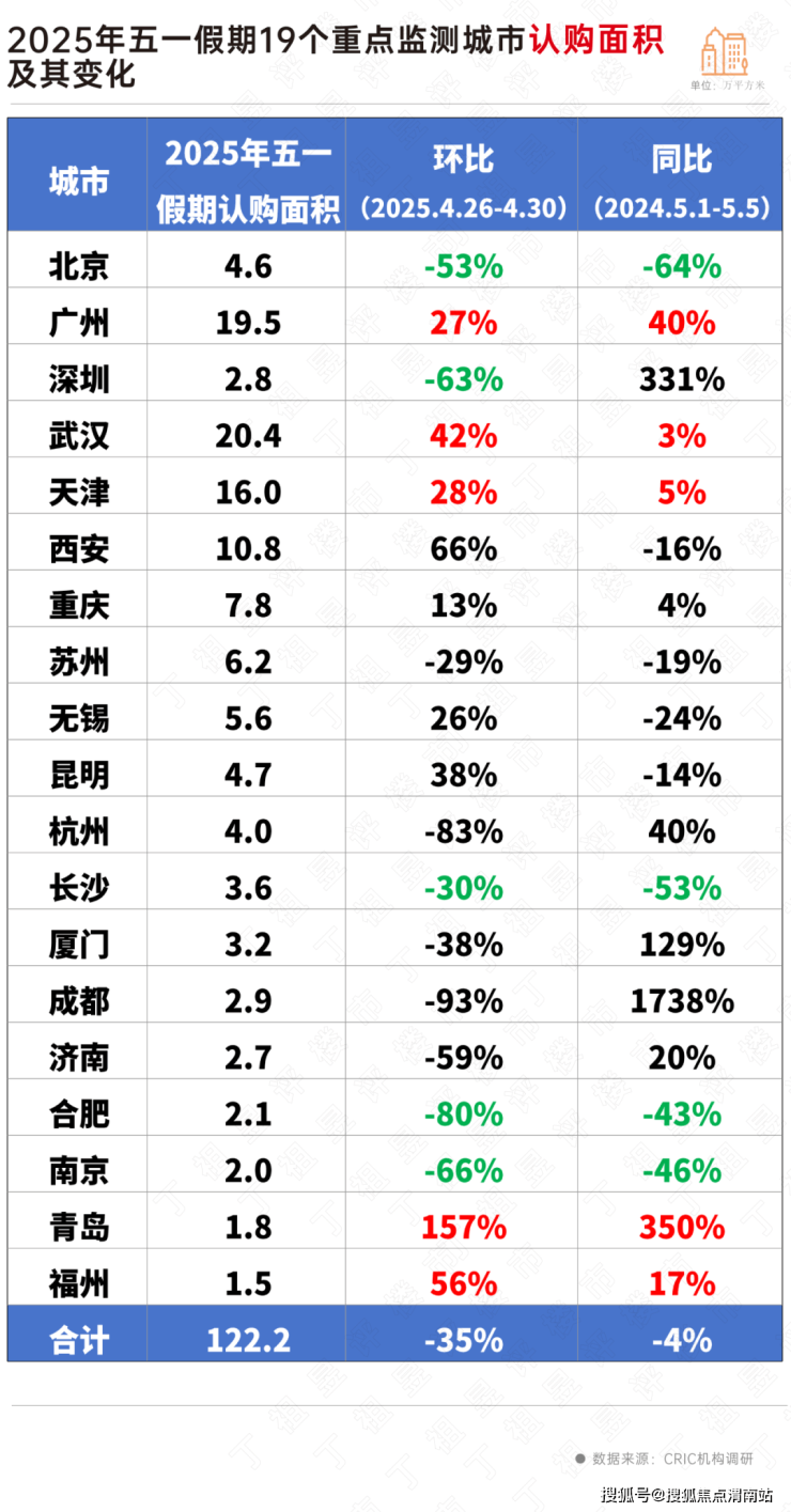 考虑到备案数据或将延迟,CRIC结合克而瑞城市机构调研数据显示,19个重点城市五一假期认购面积仅为122.2万平方米,环比下降35%,同比下降4%,回暖动力略有不足,五一整体认购表现较为平淡。
