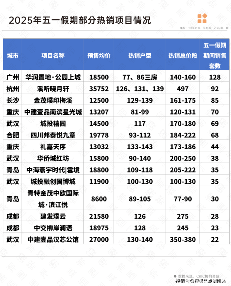 热销盘除了一些供应稀缺核心区域的改善盘之外,更多为折扣力度较大的刚需盘。比如广州的华润置地·公园上城,热销户型以77和86平方米三房为主,总价段在140-160万元,五一期间销售了128套。
