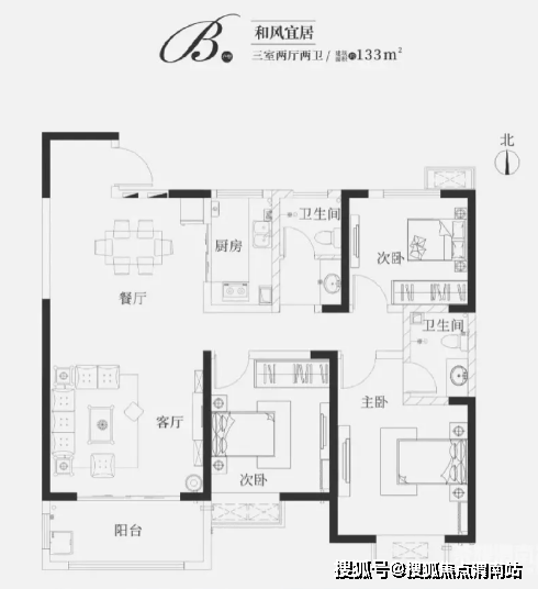面积段:132㎡、142㎡和159㎡三室两厅两卫