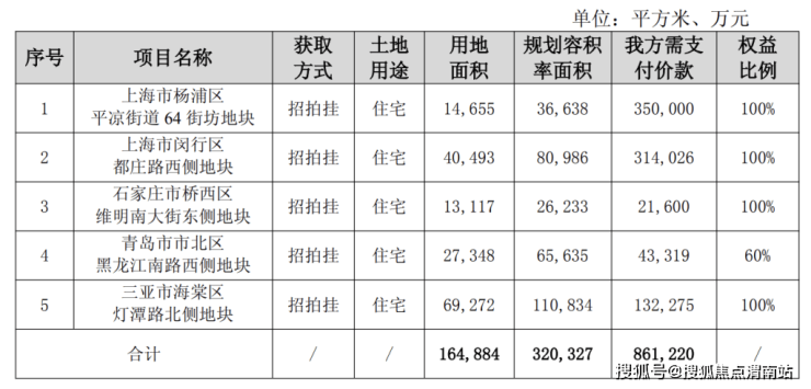 上海市闵行区都庄路西侧地块,同样通过招拍挂方式获得,用地面积40493平方米,规划容积率面积80986平方米,需支付价款31.4亿元,权益比例100%。