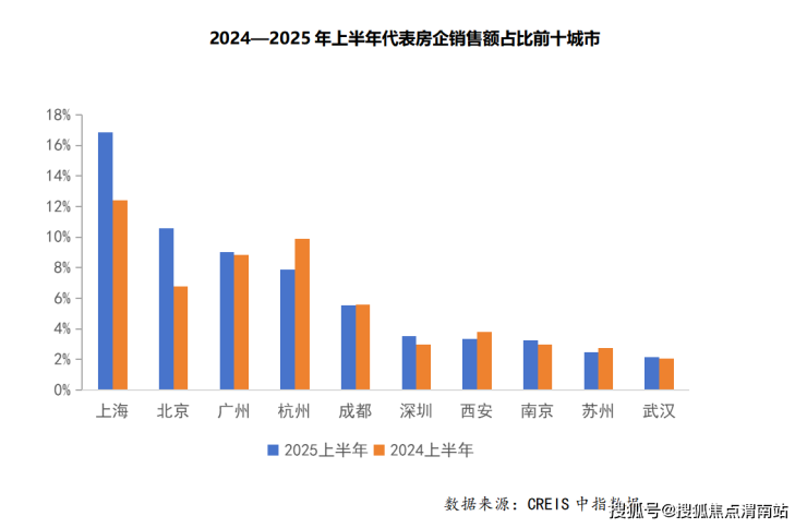 其中,上海、北京的贡献度最高,增速也最明显。上半年,上海对上述20家房企的销售贡献增长4.5个百分点,北京增长3.8个百分点。上海、北京和广州的销售额贡献率分别为16.9%、10.6%和9.0%。