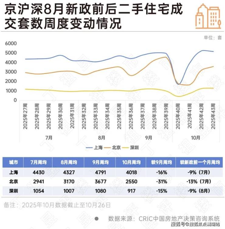 从二手房成交变动来看,新政效应减退更为显著,京沪深10月周均成交较9月周均均出现不同程度回落,与新政前一个月周均成交相比也出现了稳步下滑。