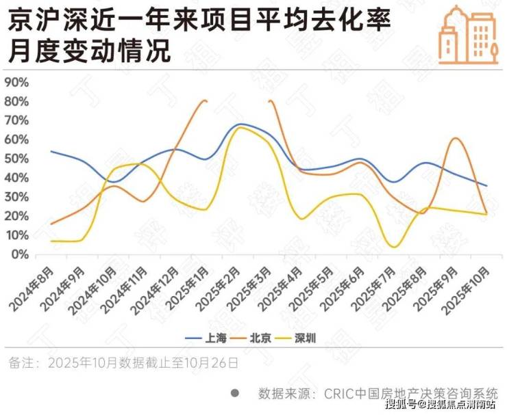 从新政前后京沪深项目去化率变动情况来看,上海、深圳呈下行趋势。上海近一年高位在2025年2月,达68%,至2025年7月降至38%,新政月8月升至48%,截至10月前26日去化率降至36%。深圳近一年也在2025年2月,达66%,最低位在7月,为4%,8-9月出现回升,截至10月前26日去化率降至21%。