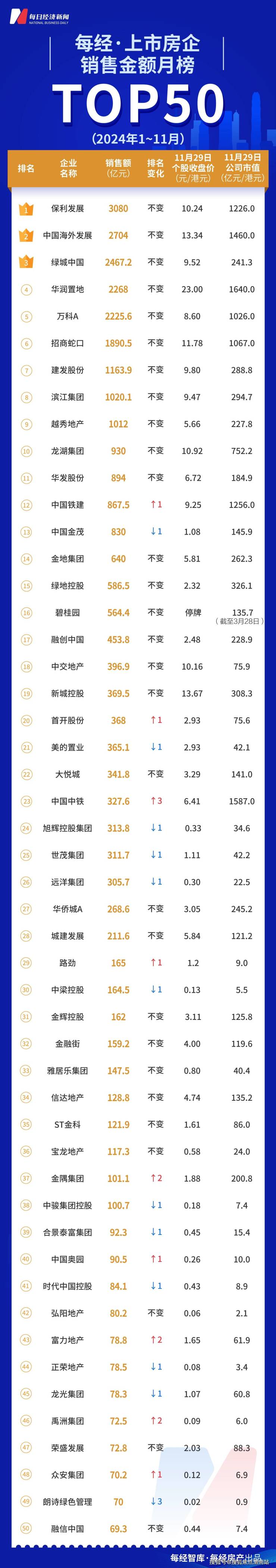 在9月底系列楼市新政组合拳的持续发力下,11月TOP50上市房企销售总额再超3000亿元,维持在年度高位。