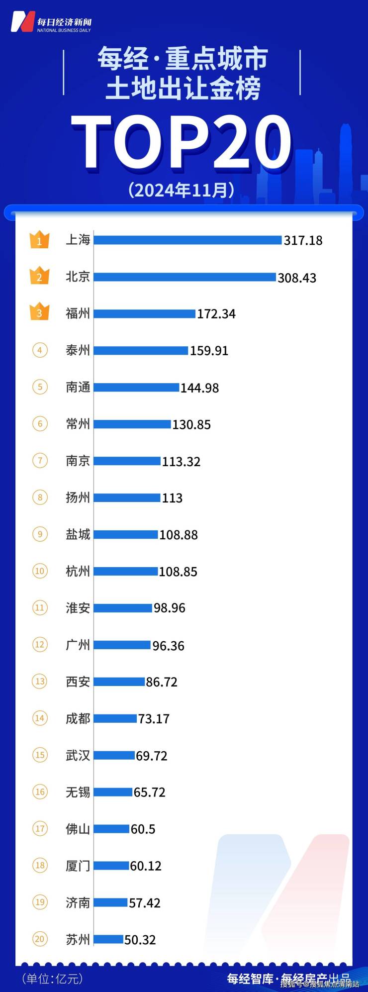 11月份,土地出让金超过100亿元的城市达10个,比10月份增加了4个。