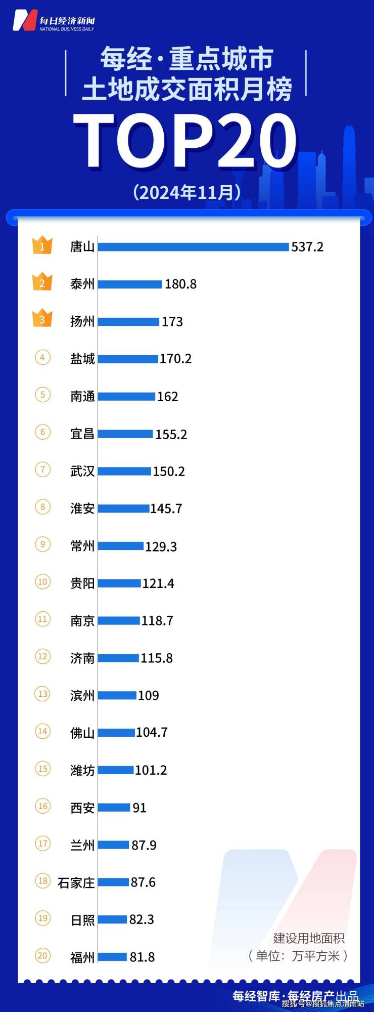 11月份,土地出让面积TOP20城市合计出让2905万平方米。其中,出让面积超百万平方米的城市有15个,也是全年最多的一个月份,唐山以537.2万平方米的出让面积排在首位。
