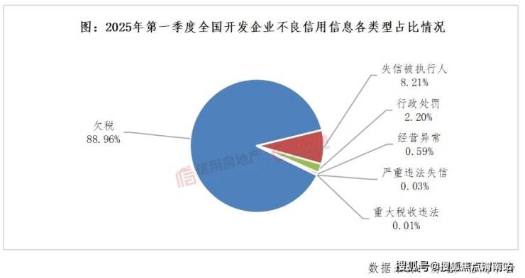 报告显示,房地产信用平台2025年一季度共收录全国房地产开发企业各类不良信用信息共计64513条,同比2024年第一季度减少27.55%,环比2024年第四季度减少28.75%。其中,欠税案例占比最高,达到全部不良信用信息的88.96%,共有57390条案例;其次是失信被执行人,共有5296条案例,占比达到8.21%。此两种失信类型构成了房地产开发企业不良信用信息的绝对“主力”,二者合计占比高达97.17%。不过,需要说明的是,欠税信息的变动,与相关部门的披露时间、查处及追溯力度有一定关系。