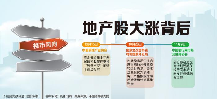 引发此轮资本市场升温的,是近期的一系列利好信息。11月9日,中国银行间市场交易商协会举行房企代表座谈会,传递出融资和并购政策松绑的消息;11月10日,沈阳疑似大幅松绑调控政策;而在近期,高盛、贝莱德等外资机构正在大举买入中国房企债券。