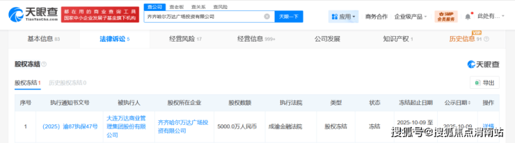 10月15日,据天眼查披露的信息显示,10月9日,大连万达商业管理集团股份有限公司新增一则股权冻结信息,股权所在企业为齐齐哈尔万达广场投资有限公司,冻结股权数额5000万元,冻结期限自2025年10月9日至2028年10月8日,执行法院为成渝金融法院。