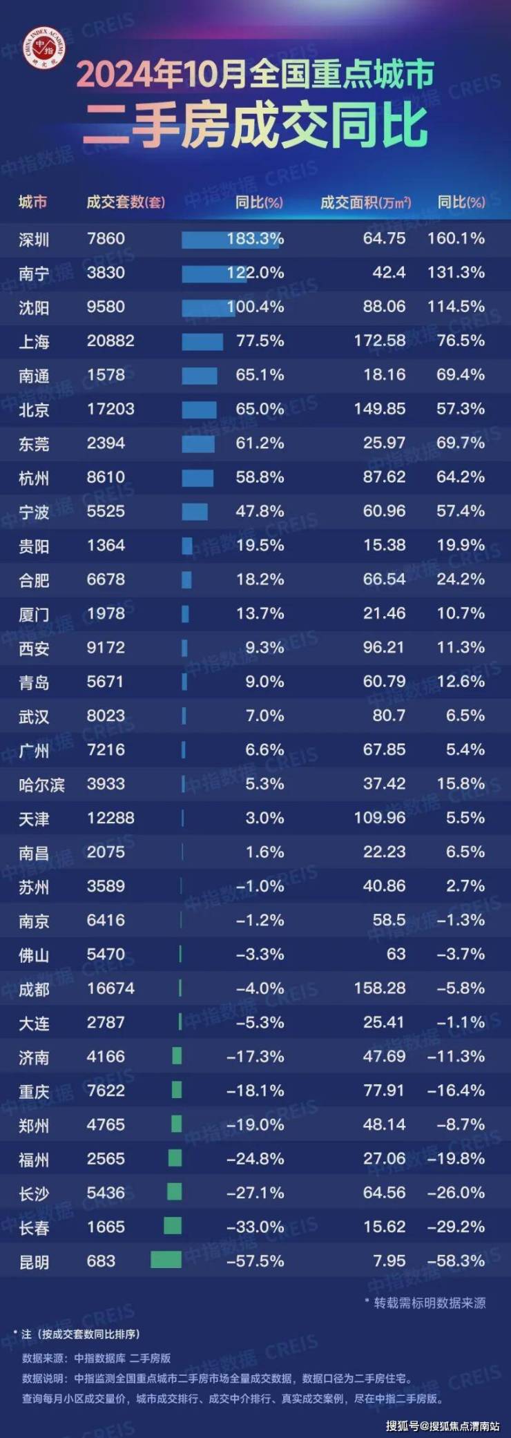 2024年10月全国重点城市二手住宅成交排名,深圳同比涨幅最高!