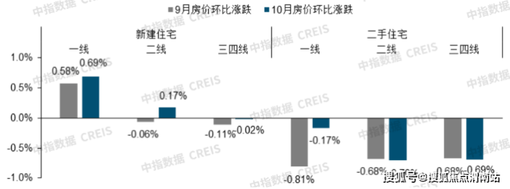 图:2024年9-10月各梯队城市新建及二手住宅价格环比涨跌变化